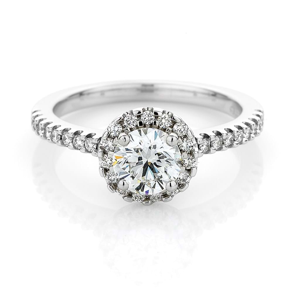 A popular design, our Alice has fine claw settings and a delicate diamond halo. This eye catching look enhances any centre diamond for more impact. The striking centre stone, haloed by diamonds, reflects and mirrors light resulting in a ring that has scintillating radiance and brilliance.