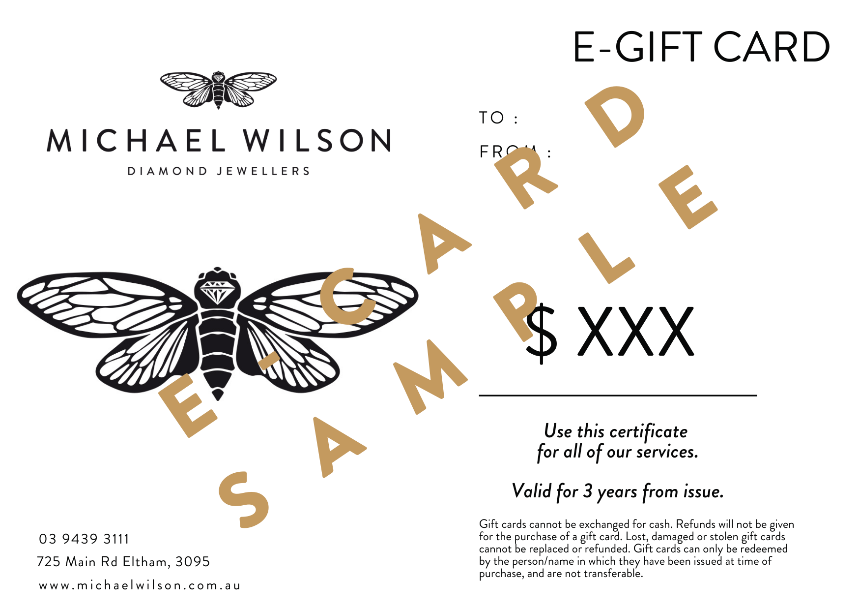A Michael Wilson gift card is great for all ages, and for any occasion. Gift cards are perfect for loved ones who might like to select their own gift. Or for group giving, where more than one family member or friend is contributing to the gift.