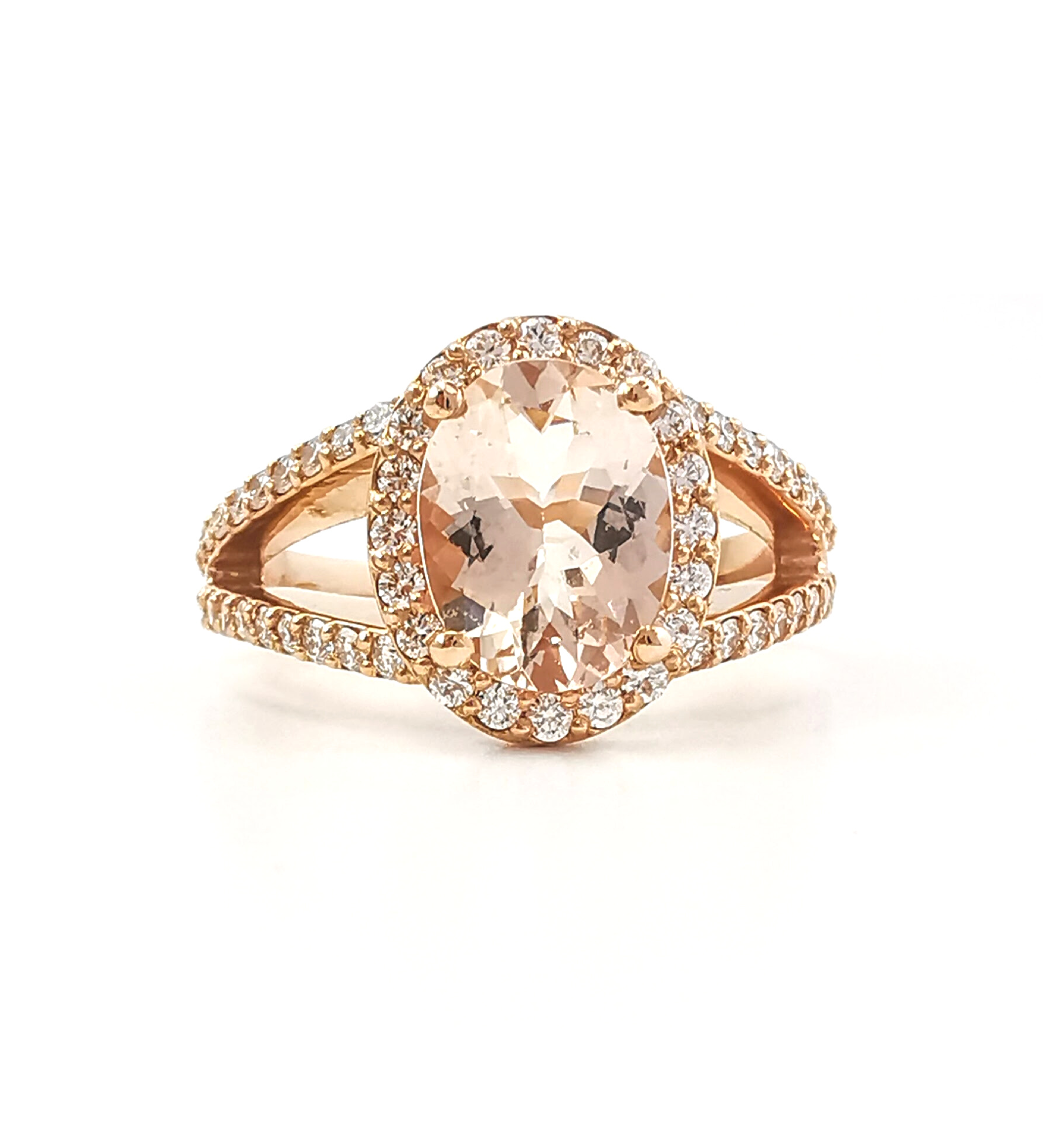 This is a romantic design featuring a haloed 1.40ct morganite, held by a diamond split band set in 18ct rose gold. It is a unique engagement ring for those who are looking for a little colour or a stunning dress or anniversary ring.