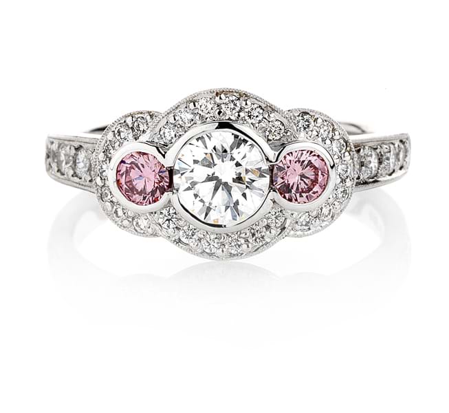 Featuring two stunning rare Argyle pink diamonds, this dreamy 18ct white gold ring is one for the true romantics. Our Deco Ring is a beautiful engagement ring, or an heirloom in the making, for those who are seeking a classic engagement or anniversary ring.