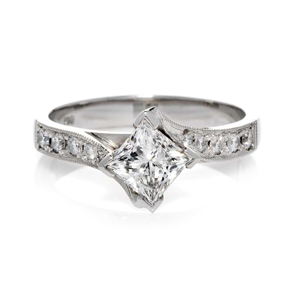 Featuring a claw set princess cut diamond with upswept crossover grainset shoulders. The Alise is a twist on a classic, making a beautiful solitaire engagement ring with an elegant and sophisticated difference.