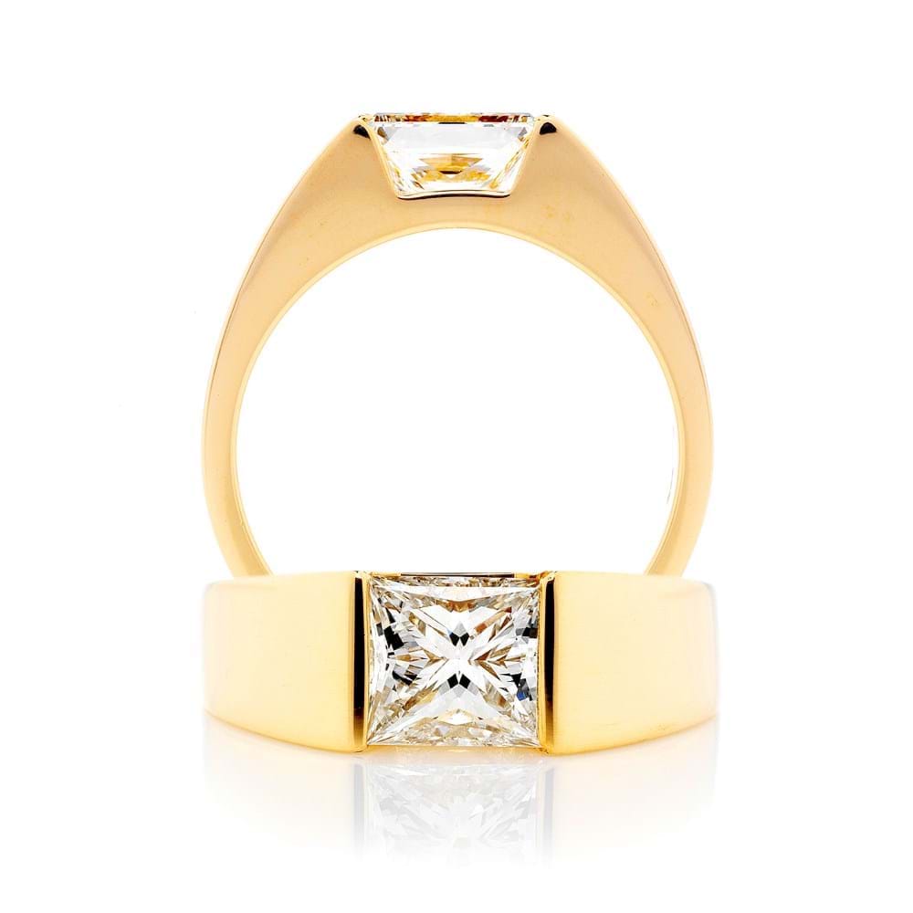 The Atlantica is a clean streamlined design. It features a princess cut diamond in a tension set 'look' but with added security. This is a beautiful modern design that is safe for everyday wear. No catching, pure elegance. Sophisticated and stylish.