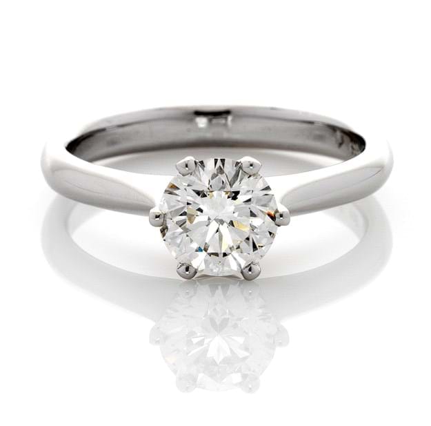 Flawlessly hand-crafted, the six-claw setting cradles the high quality round brilliant cut diamond, making it appear almost like a floating drop of scintillating light.