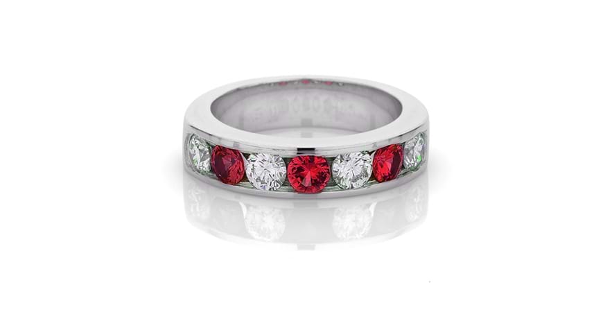 Streamline channel set stones alternating rubies with diamonds. This makes an exquisite birthday or anniversary gift, or a wonderful gift for a new mother. Ruby is the birthstone for July and the symbol for a 40th wedding anniversary.